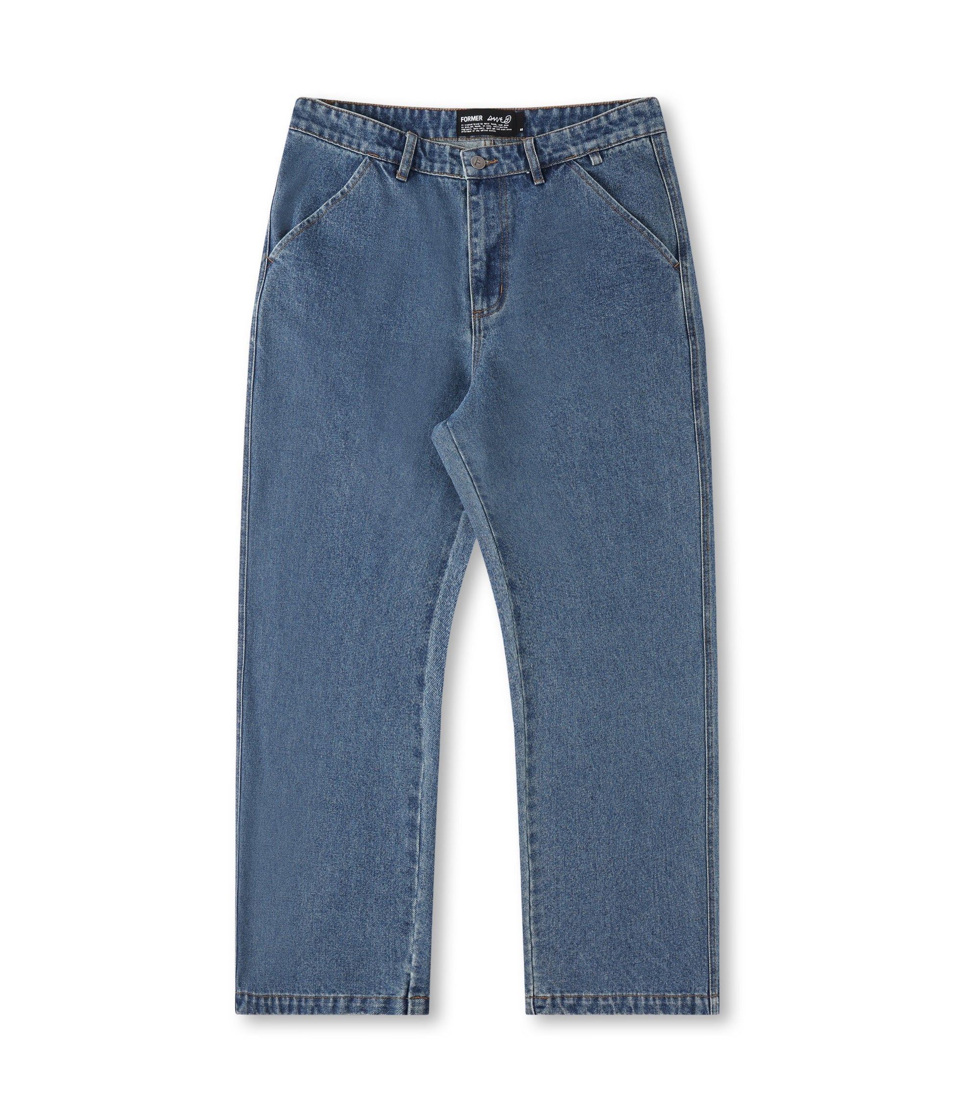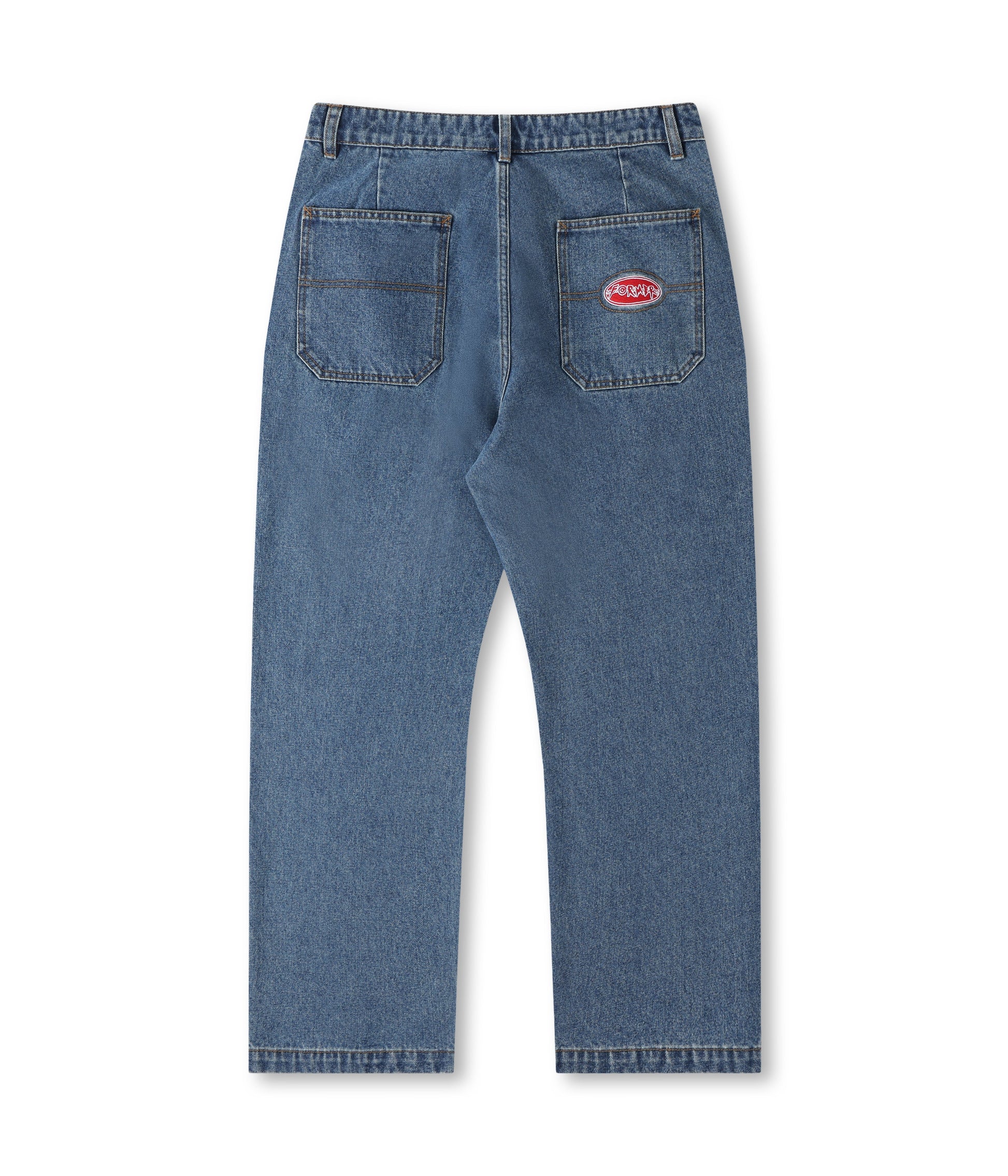 Designed by FORMER founder Dane Reynolds, the Reynolds Flatline Denim Pant is constructed from premium 100% cotton denim and delivered in our signature Reynolds work pant fit with a 19" leg opening. Featuring a fixed waist, back pocket embroidery graphic, double workwear pockets, contrast stitching, and FORMER branded metal shank button.
