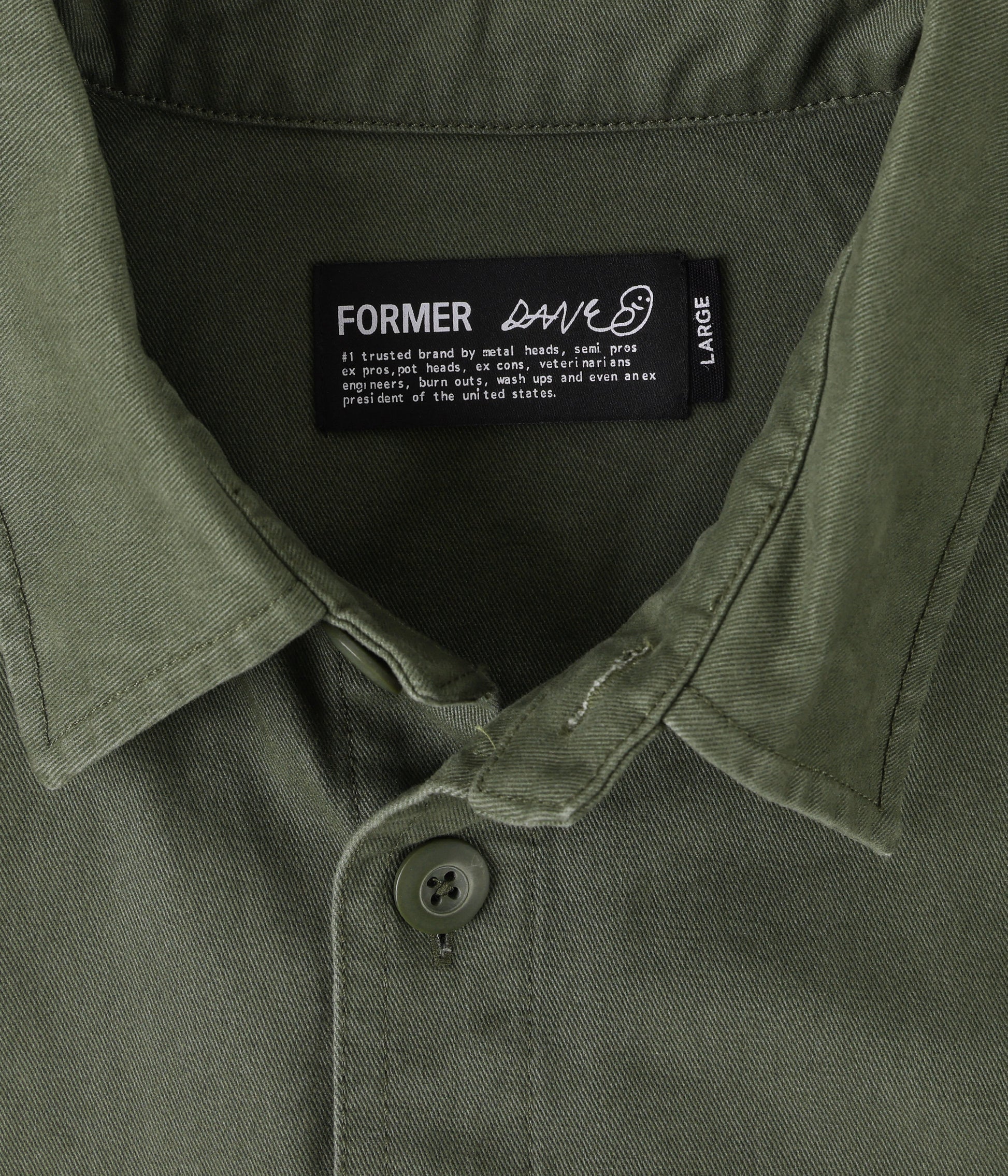 Crafted in 100% cotton twill and designed in collaboration with FORMER founder Dane Reynolds. Delivered in our FORMER overshirt fit. Featuring front graphic embroidery on chest pocket, double chest pockets, and military button closure.