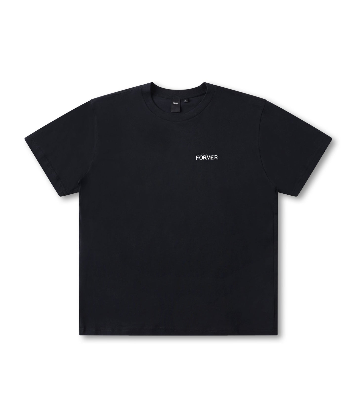Designed in a premium 200GSM jersey cotton and delivered in our standard T-shirt block for a modern and comfortable fit. Featuring front and back graphics in a soft hand plastisol screen print on a solid black base color.